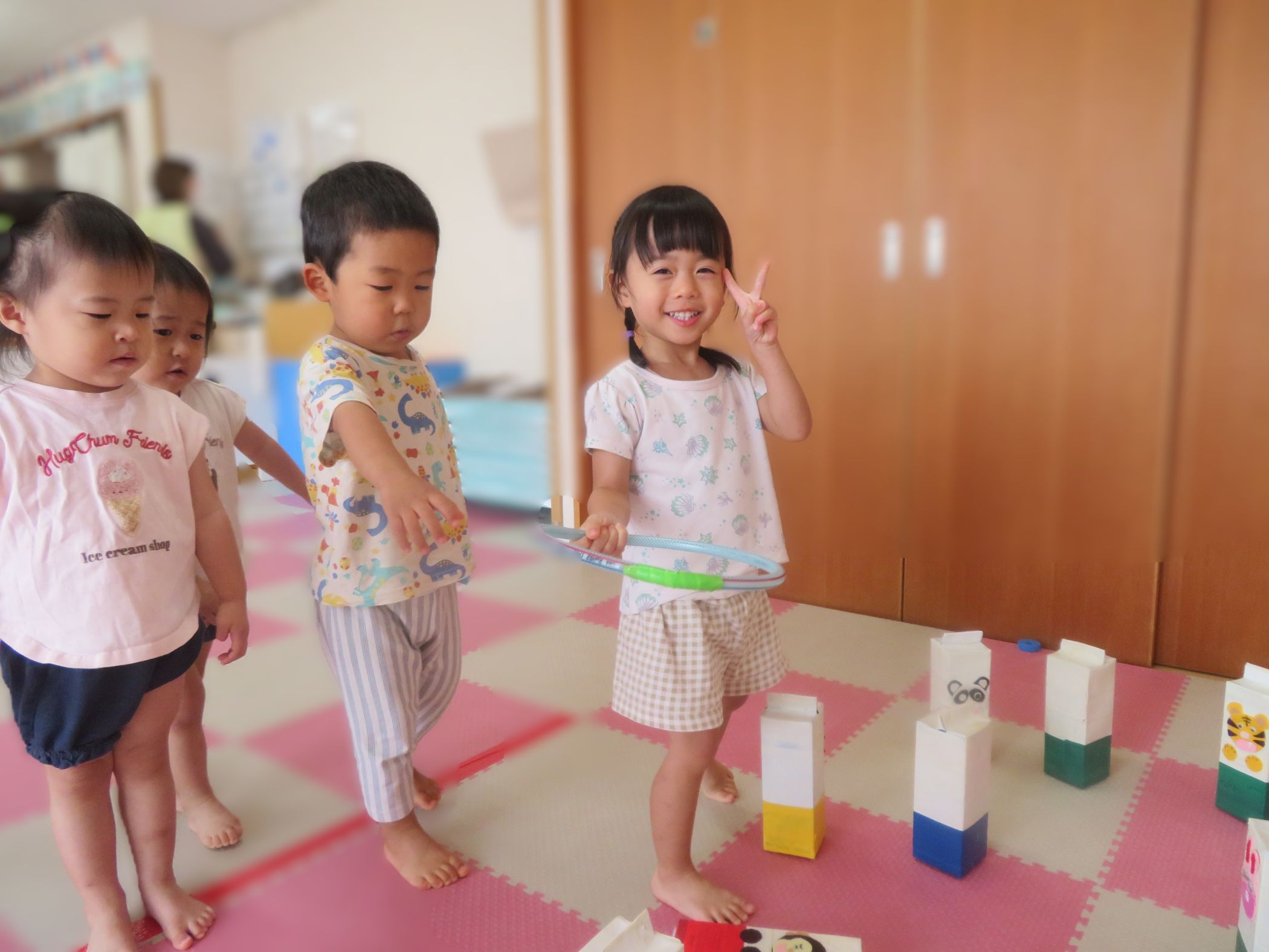 体を動かす遊びも大好きないるか組さんなので室内でも元気いっぱい!少し難しい輪投げにも挑戦しました!「難しいよ~」と苦戦しながらも何度も挑戦しどんどん上達していきました😊