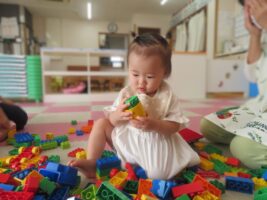 らっこ組は、両手にブロックを持って、カチカチと音を鳴らしてみる子、ブロックを積み重ねては倒して…を繰り返して遊ぶ子、ブロックの遊び方がどんどん広がっています!自分で遊びを見つける力がどんどん育っていますよ😊