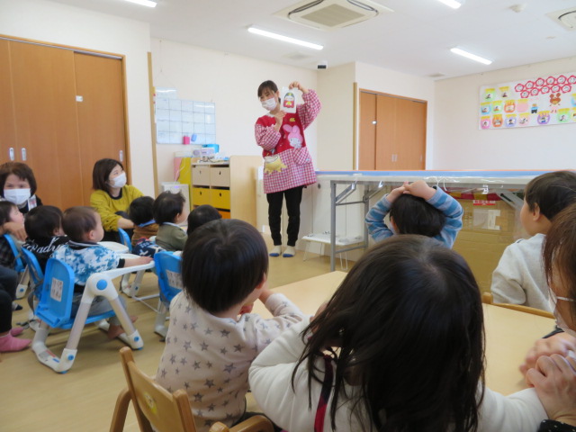 最初に、ひなまつりについてお話を聞きました。その後、ひなまつりの音楽を聞きながら、皆でおやつにひなまつりゼリーを食べました。