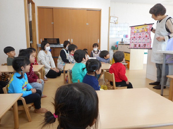 ひなまつりは、女の子の健やかな成長を願って行う行事ですが、おひな様のタペストリーを見せると、男の子も「お家にある!」と、興味津々で参加していました。