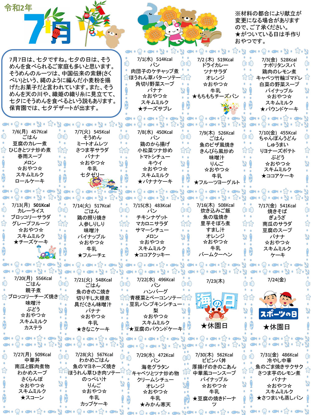 ブログ BLOG 2020.07.01 献立 2020年7月の献立 7月7日は、七夕ですね。 七夕の日は、そうめんを食べられるご家庭も多いと思います。 そうめんのルーツは、中国伝来の索餅(さくべい)という、縄のように編んだ小麦粉を揚げたお菓子だと言われています。 また、そうめんを天の川や、織姫の織り糸に見立てて、七夕にそうめんを食べるという説もあります。 保育園では、七夕デザートが出ます。 ※食材は、納入状況により変動することがありますので、予めご了承下さい。 ※★がついている日は、手作りおやつです。 前へ 一覧に戻る 次へ