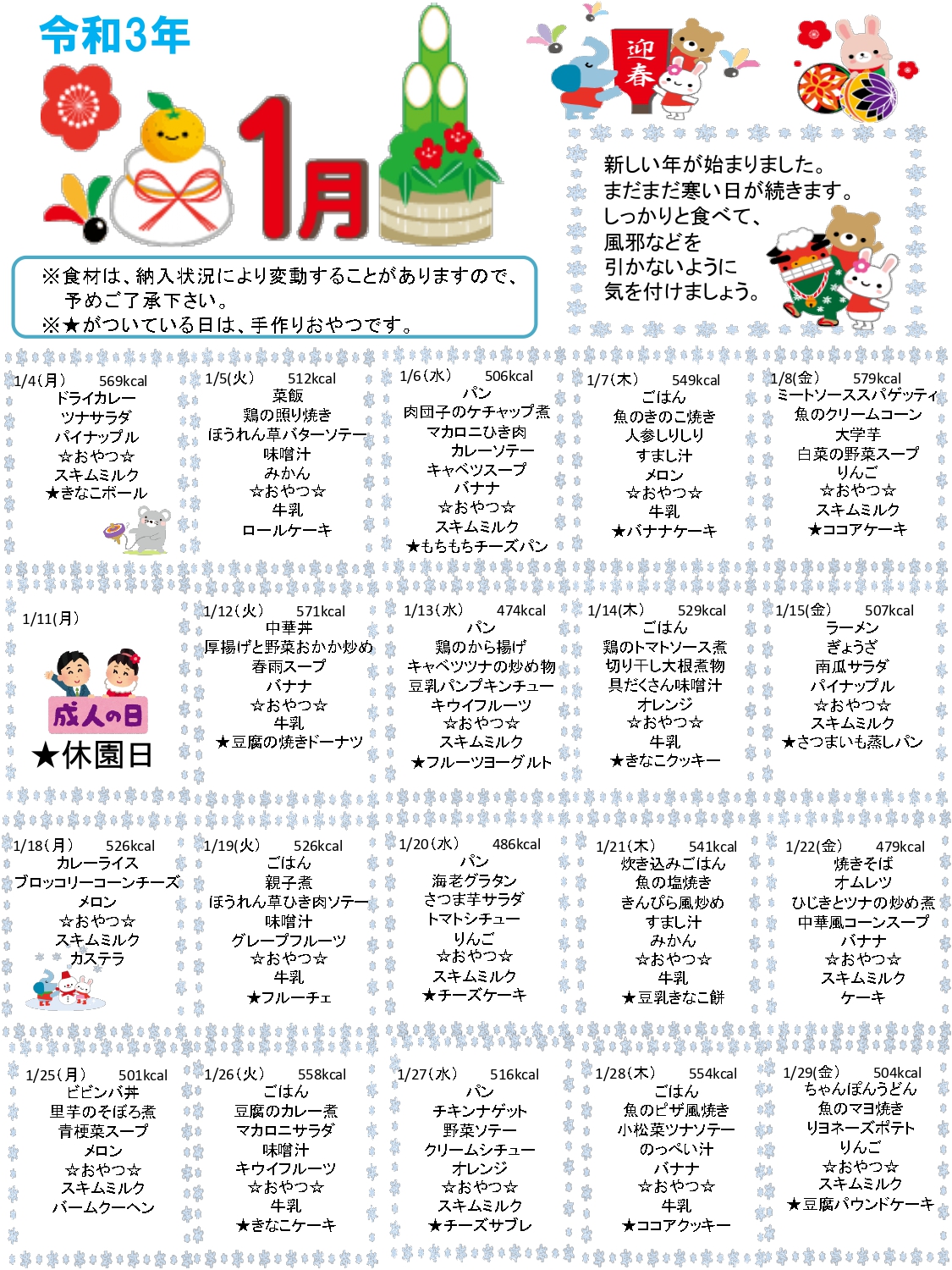 ブログ BLOG 2020.12.27 献立 2021年1月の献立 新しい年が始まりました。 まだまだ寒い日が続きます。 しっかりと食べて、風邪などを引かないように気を付けましょう。 ※食材は、納入状況により変動することがありますので、予めご了承下さい。 ※★がついている日は、手作りおやつです。 前へ 一覧に戻る 次へ