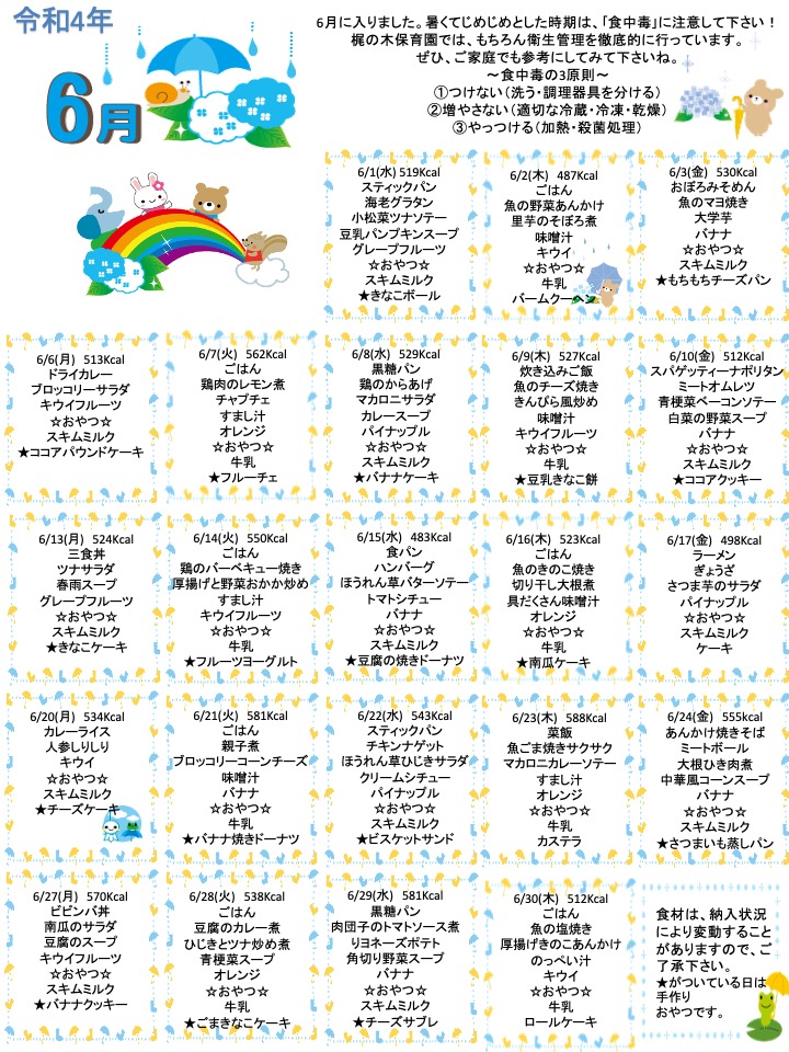 ブログ BLOG 2022.05.27 献立 2022年6月の献立 6月に入りました。暑くてじめじめとした時期は、「食中毒」に注意して下さい! 梶の木保育園では、もちろん衛生管理を徹底的に行っています。 ぜひ、ご家庭でも参考にしてみて下さいね。 ~食中毒の3原則~ ①つけない(洗う・調理器具を分ける) ②増やさない(適切な冷蔵・冷凍・乾燥) ③やっつける(加熱・殺菌処理) ※食材は、納入状況により変動することがありますので、予めご了承下さい。 ※★がついている日は、手作りおやつです。 前へ 一覧に戻る 次へ
