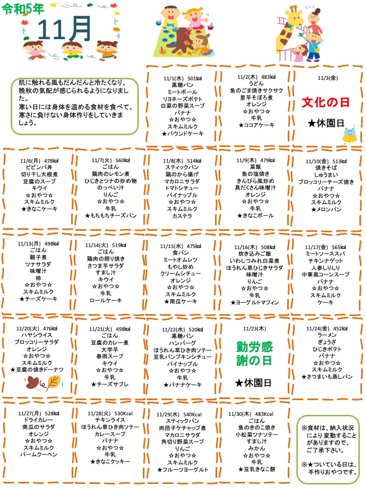 ブログ BLOG 2023.11.08 献立 2023年11月の献立 肌に触れる風もだんだんと冷たくなり、晩秋の気配が感じられるようになりました。 寒い日には身体を温める食材を食べて、寒さに負けない身体作りをしていきましょう。 ※食材は、納入状況により変動することがありますので、予めご了承下さい。 ※★がついている日は、手作りおやつです。 前へ 一覧に戻る 次へ