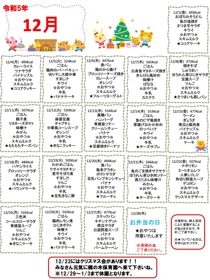 ブログ BLOG 2023.11.28 献立 2023年12月の献立 12/22にはクリスマス会があります!! みなさん元気に梶の木保育園へ来て下さいね。 ※12/29~1/3まで休園となります。 ※食材は、納入状況により変動することがありますので、予めご了承下さい。 ※★がついている日は、手作りおやつです。 前へ 一覧に戻る 次へ