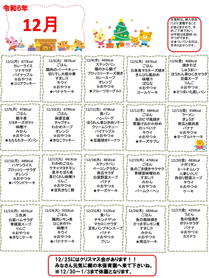 ブログ BLOG 2024.11.29 献立 2024年12月の献立 12/25にはクリスマス会があります!! みなさん元気に梶の木保育園へ来て下さいね。 ※12/30~1/3まで休園となります。 ※食材は、納入状況により変動することがありますので、予めご了承下さい。 ※★がついている日は、手作りおやつです。 前へ 一覧に戻る 次へ