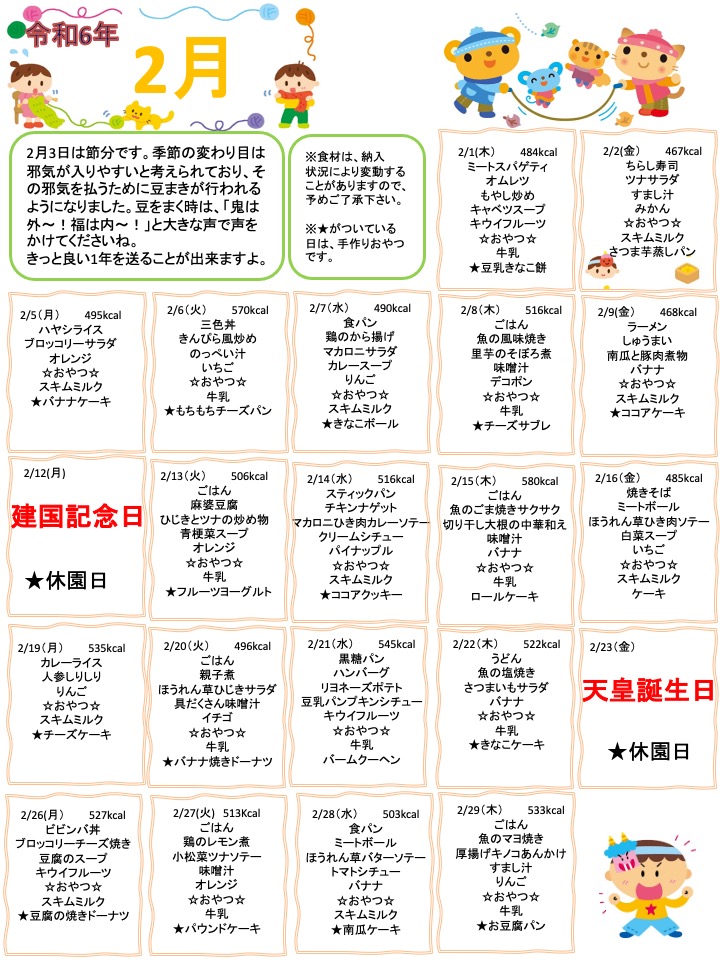 ブログ BLOG 2024.01.26 献立 2024年2月の献立 2月3日は節分です。 季節の変わり目は邪気が入りやすいと考えられており、その邪気を払うために豆まきが行われるようになりました。 豆をまく時は、「鬼は外~!福は内~!」と大きな声で声をかけてくださいね。 きっと良い1年を送ることが出来ますよ。 ※食材は、納入状況により変動することがありますので、予めご了承下さい。 ※★がついている日は、手作りおやつです。 前へ 一覧に戻る 次へ