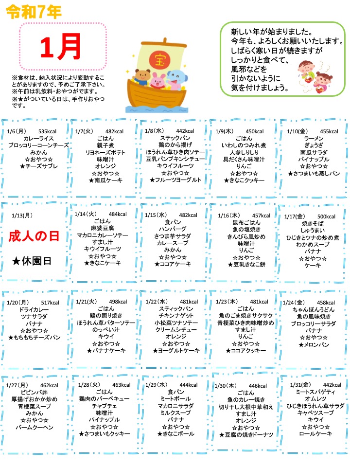 ブログ BLOG 2024.12.25 献立 2025年1月の献立 新しい年が始まりました。 今年も、よろしくお願いいたします。 しばらく寒い日が続きますがしっかりと食べて、 風邪などを引かないように気を付けましょう。 ※食材は、納入状況により変動することがありますので、予めご了承下さい。 ※★がついている日は、手作りおやつです。 前へ 一覧に戻る 次へ