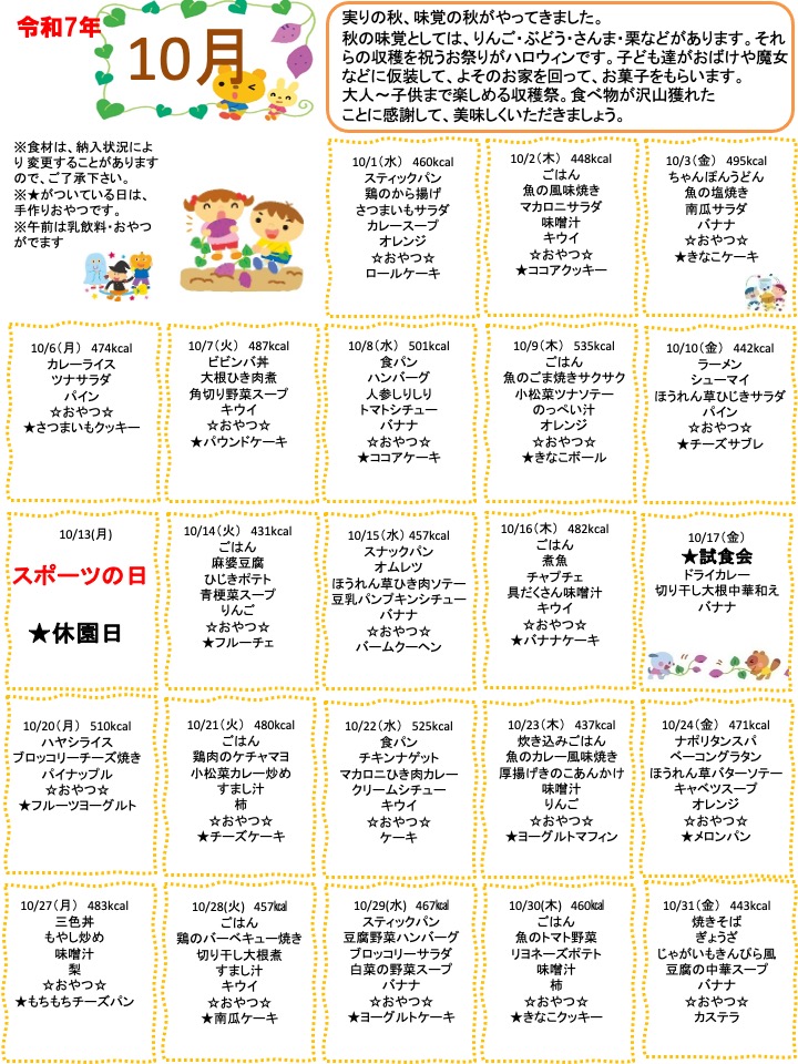 ブログ BLOG 2025.09.26 献立 2025年10月の献立 実りの秋、味覚の秋がやってきました。 秋の味覚としては、りんご・ぶどう・さんま・栗などがあります。 それらの収穫を祝うお祭りがハロウィンです。子ども達がおばけや魔女などに仮装して、よそのお家を回って、お菓子をもらいます。 大人~子供まで楽しめる収穫祭。 食べ物が沢山獲れたことに感謝して、美味しくいただきましょう。 ※納入状況により献立が変更になる場合がありますので、ご了承ください。 ※★がついている日は、手作りおやつです。 前へ 一覧に戻る 次へ
