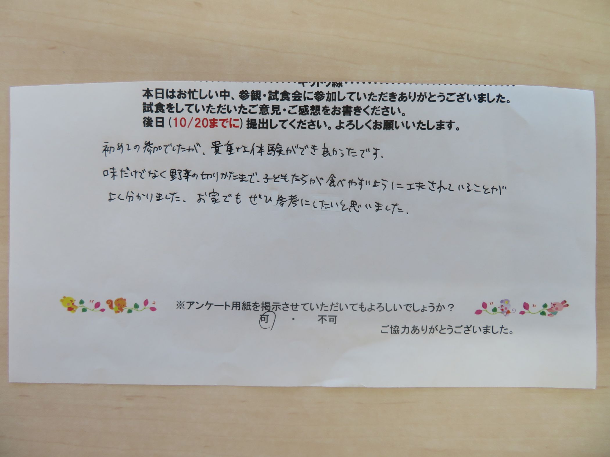 保護者様からの声 VOICE 2025年度 給食について 初めての参加でしたが貴重な体験ができ、 良かったです。味だけでなく野菜の切り方まで 子どもたちが食べやすいように 工夫されていることがよく分かりました。 お家でもぜひ参考にしたいと思いました。 前へ 一覧に戻る 次へ