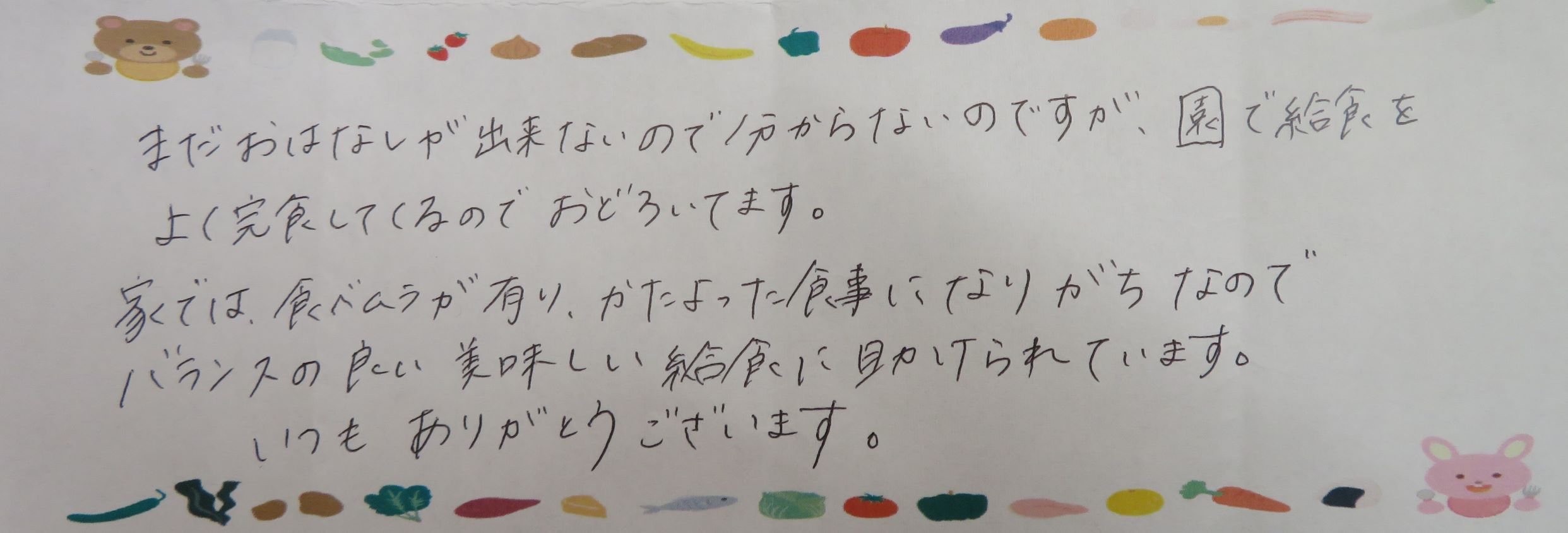 まだおはなしが出来ないので分からないのですが、園で給食をよく完食してくるのでおどろいてます。家では食べムラが有り、かたよった食事になりがちなのでバランスの良い美味しい給食に助けられています。いつもありがとうございます。