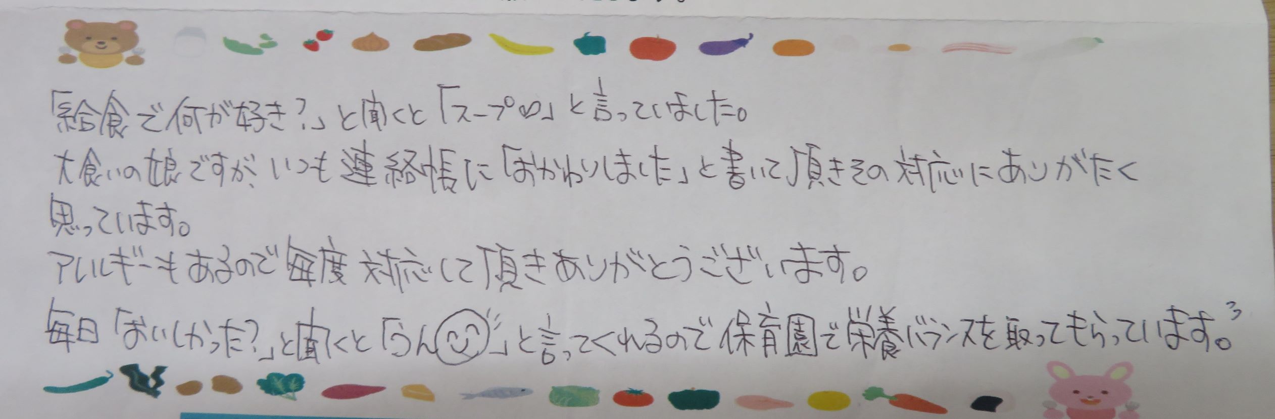 「給食で何が好き?」と聞くと「スープ♡」と言っていました。大食いの娘ですが、いつも連絡帳に「おかわりしました」と書いて頂きその対応にありがたく思っています。アレルギーもあるので毎度対応して頂きありがとうございます。毎日「おいしかった?」と聞くと「うん😊」と言ってくれるので保育園で栄養バランスを取ってもらっています。