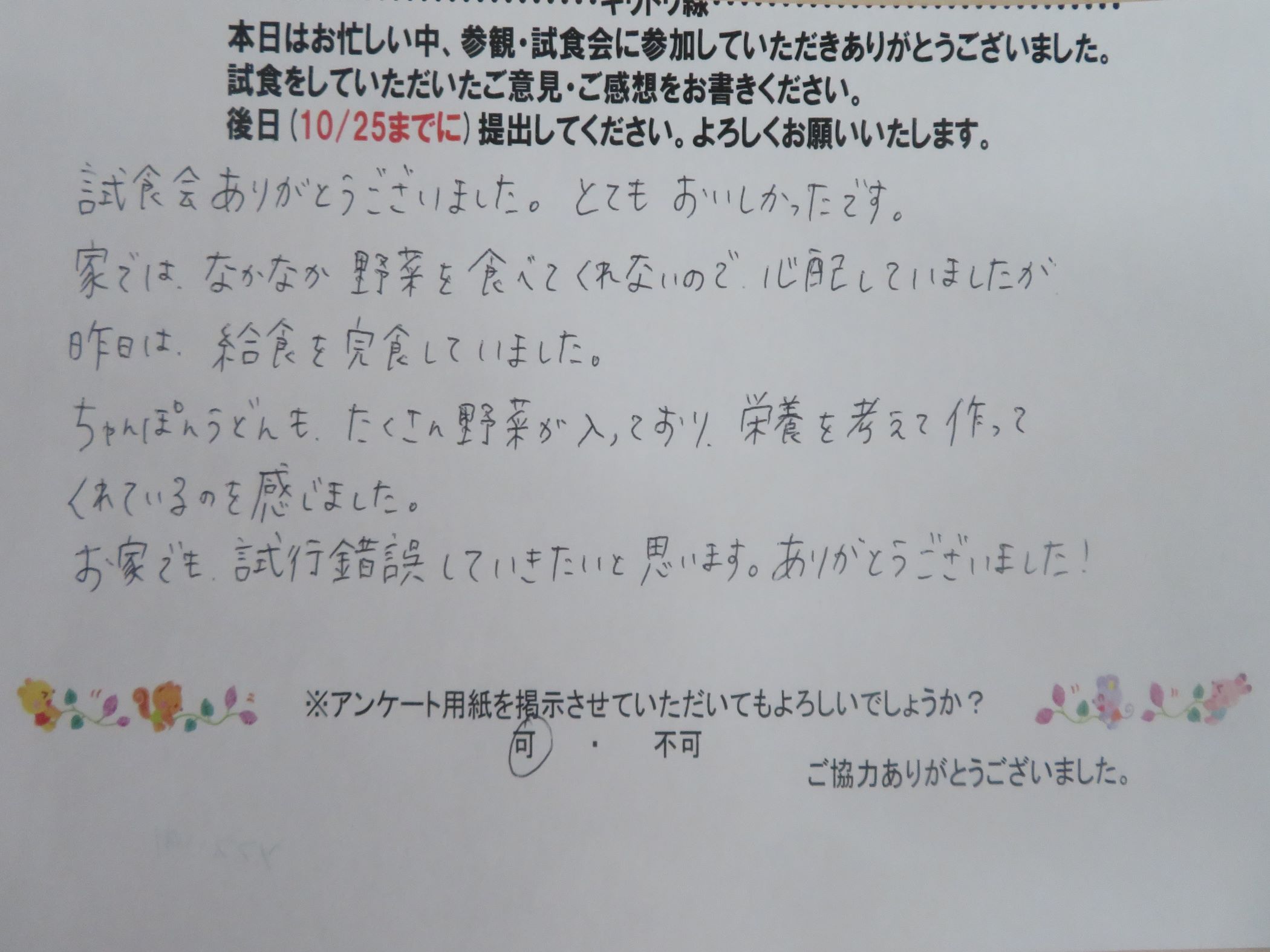 保護者様からの声 VOICE 2024年度 給食について 試食会ありがとうございました。 とてもおいしかったです。 家ではなかなか野菜を食べてくれないので、心配していましたが、昨日は給食を完食していました。 ちゃんぽんうどんも、たくさん野菜が入っており、栄養を考えて作ってくれているのを感じました。 お家でも試行錯誤していきたいと思います。 ありがとうございました! 前へ 一覧に戻る 次へ