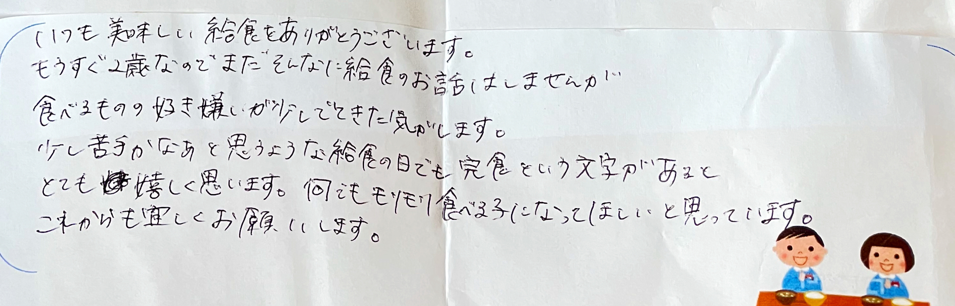 保護者様からの声 VOICE 2021年度 給食について いつも美味しい給食をありがとうございます。 もうすぐ2歳なのでまだそんなに給食のお話はしませんが 食べるものの好き嫌いが少し出てきた気がします。 少し苦手かなあと思うような給食の日でも完食という文字があるととても嬉しく思います。 何でもモリモリ食べる子になってほしいと思っています。 これからも宜しくお願いします。 前へ 一覧に戻る 次へ