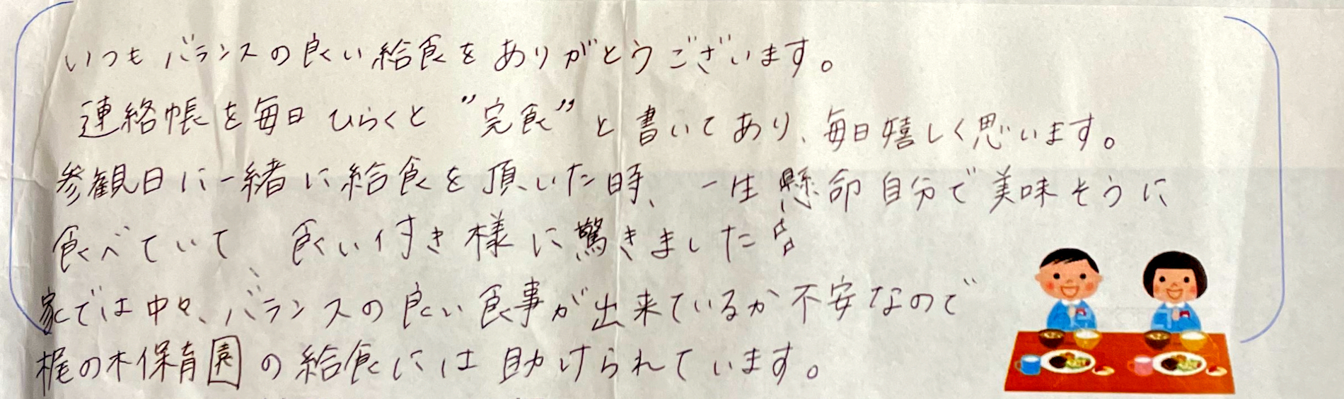 保護者様からの声 VOICE 2021年度 給食について いつもバランスの良い給食をありがとうございます。 連絡帳を毎日ひらくと”完食”と書いてあり、毎日嬉しく思います。 参観日に一緒に給食を頂いた時、一生懸命自分で美味しそうに食べていて食い付き様に驚きました。 家では中々、バランスの良い食事が出来ているか不安なので梶の木保育園の給食には助けられています。 前へ 一覧に戻る 次へ