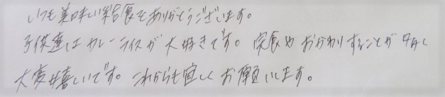 保護者様からの声 VOICE 2021年度 給食について いつも美味しい給食をありがとうございます。 子供達はカレーライスが大好きです。完食やおかわりすることが多く 大変嬉しいです。これからも宜しくお願いします。 前へ 一覧に戻る 次へ