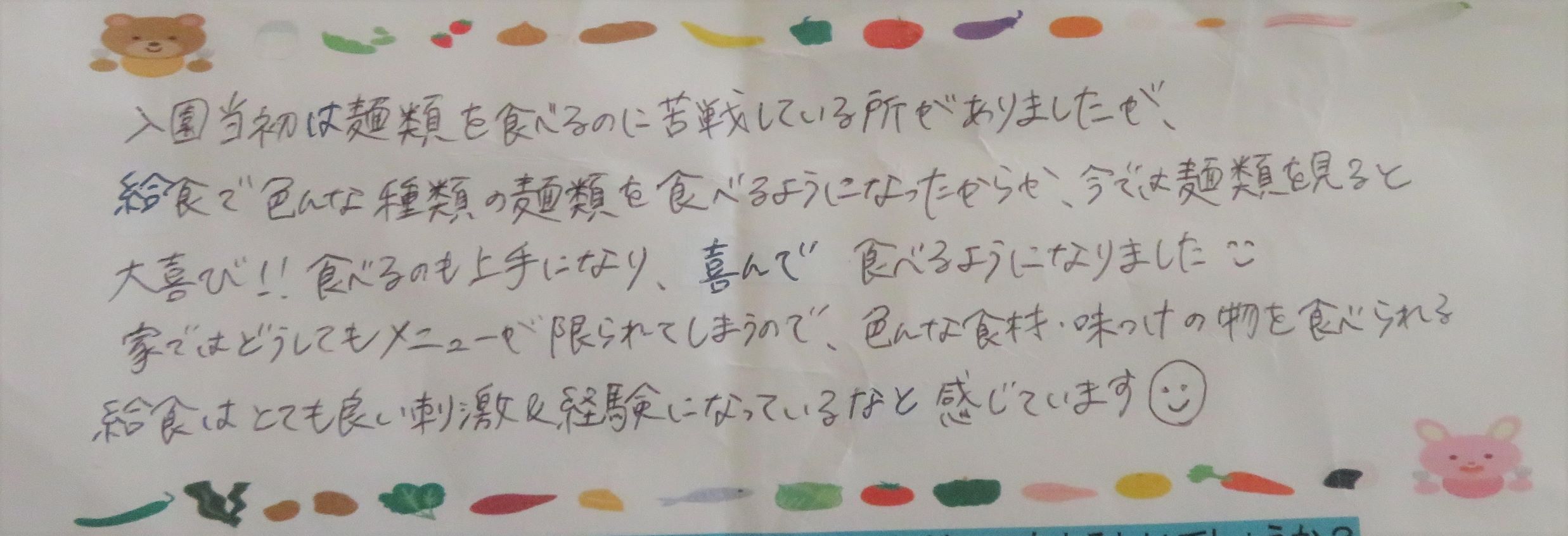 保護者様からの声 VOICE 2021年度 給食について 入園当所は麺類を食べるのに苦戦している所がありましたが、 給食で色んな種類の麵類を食べるようになったからか、今では麺類を見ると 大喜び‼食べるのも上手になり、喜んで食べるようになりました😊 家ではどうしてもメニューが限られてしまうので、色んな食材・味付けの物を食べられる 給食はとてもよい刺激&経験になっているなと感じています😊 前へ 一覧に戻る 次へ