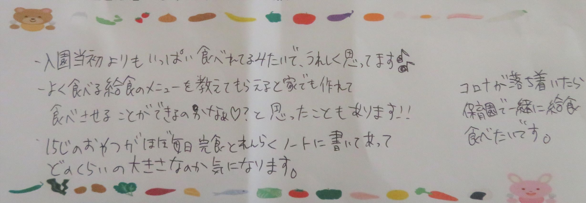 保護者様からの声 VOICE 2021年度 給食について ・入園当所よりもいっぱい食べれてるみたいで、うれしく思ってます♪ コロナが落ち着いたら ・よく食べる給食のメニューを教えてもらえると家でも作れて 保育園で一緒に給食 食べさせることができるのかなぁ💓?と思ったこともあります‼ 食べたいです。 ・15時のおやつがほぼ毎日完食とれんらくノートに書いてあって どのくらいの大きさなのか気になります。 前へ 一覧に戻る 次へ
