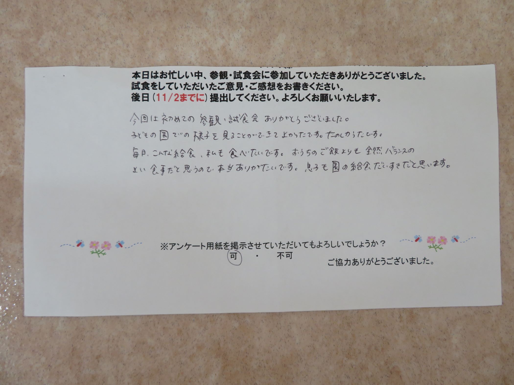 保護者様からの声 VOICE 2023年度 給食について 今回は初めての参観・試食会ありがとうございました。 子どもの園での様子を見ることができてよかったです。たのしかったです。 毎日、こんな給食、私も食べたいです。おうちのご飯よりも全然バランスのよい食事だと思うので本当ありがたいです。 息子も園の給食だいすきだと思います。 前へ 一覧に戻る 次へ